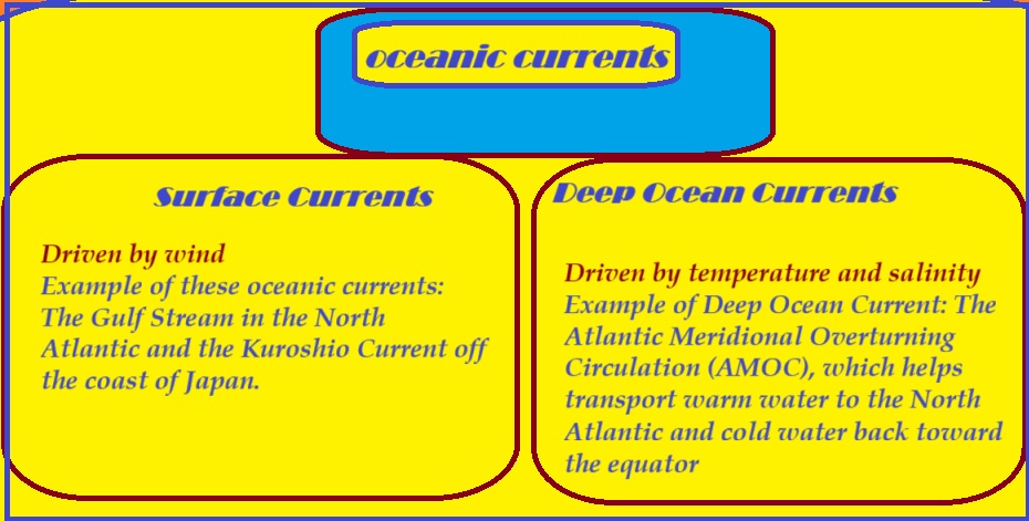 - Example of Deep Ocean Current: The Atlantic Meridional Overturning Circulation (AMOC), which helps transport warm water to the North Atlantic and cold water back toward the equator.