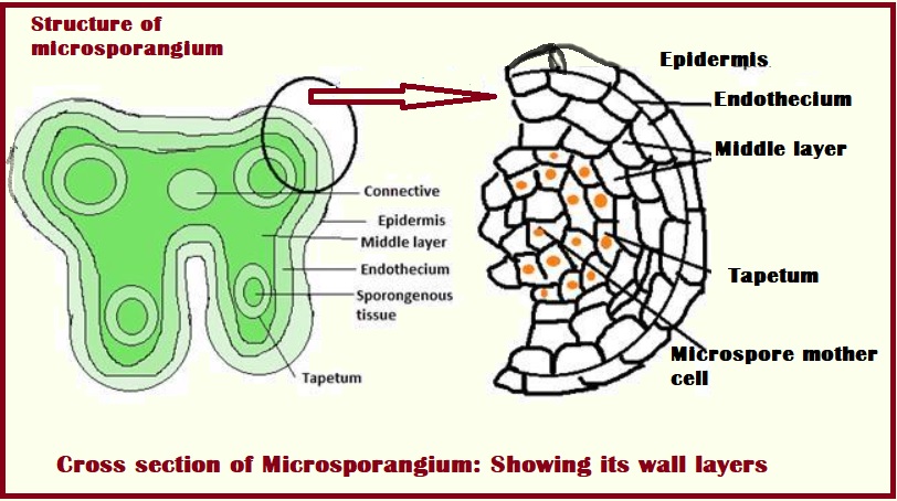 • A microsporangium is surrounded by four wall layers, i.e. epidermis, endothecium, middle layer, and tapetum.