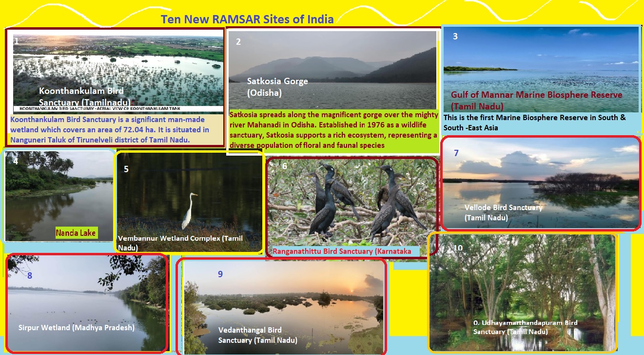 India added 10 more wetlands designated as Ramsar sites. These sites include six sites in Tamil Nadu, one each in Goa, Karnataka, Madhya Pradesh, and Odisha.